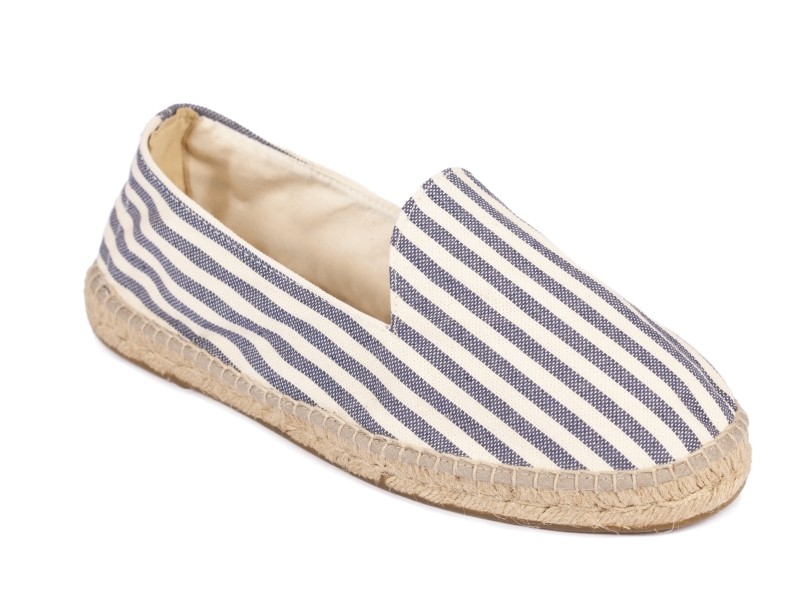 Alpargata de yute plana en lona estampada de rayas y con lengüeta o copete en el empeine. Lona con forro interior textil y talonera reforzada para mayor resistencia y comodidad. Suela recubierta de una fina capa de caucho antideslizante para alargar la duración del yute y mejorar la adherencia.