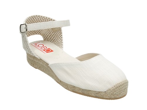 Alpargata de yute de cuña baja en tela de lino con pulsera al tobillo y talonera de tela de saco.