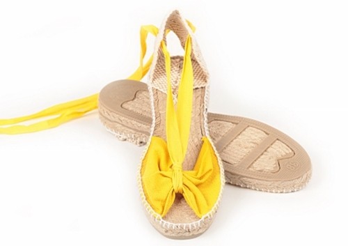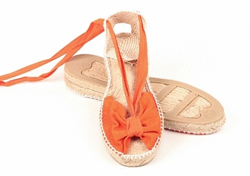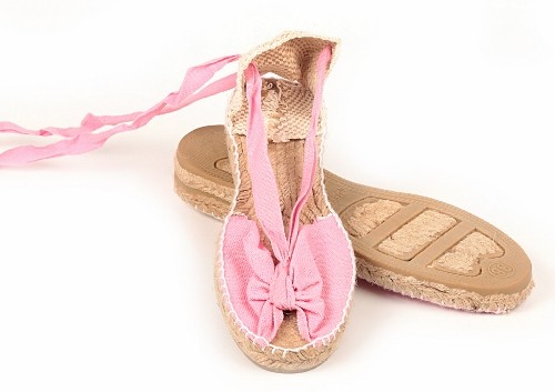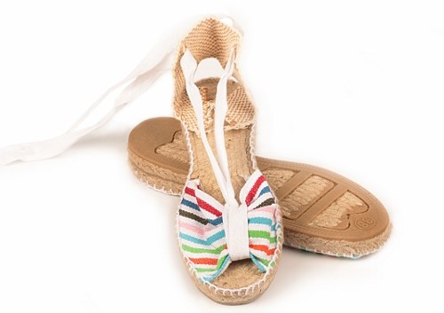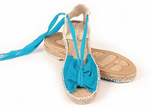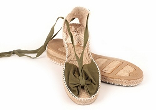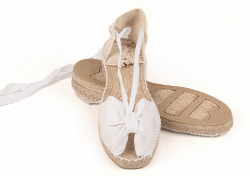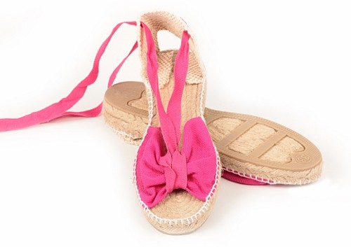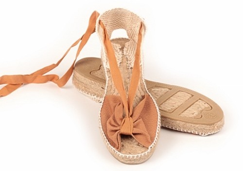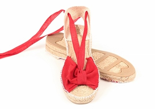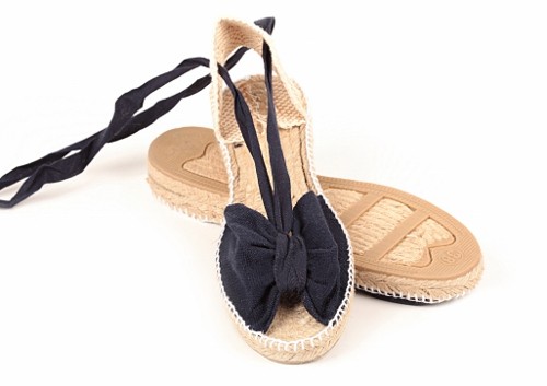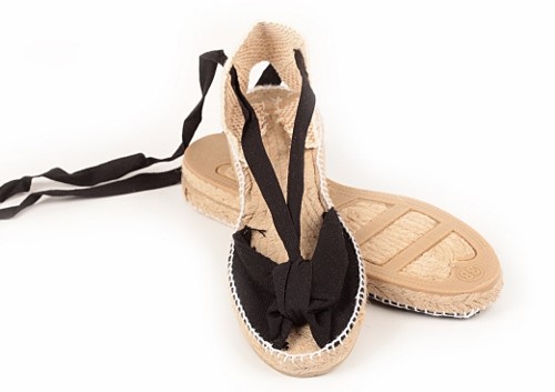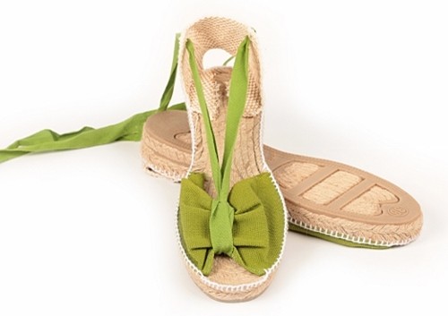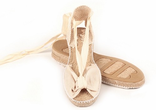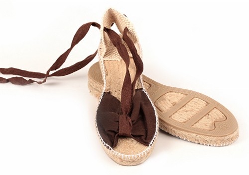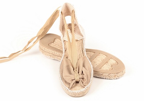 Alpargata de yute de cuña baja con cintas para atar al tobillo, talonera de tela de saco, abierta por delante y con el empeine en “mariposa” ajustable.