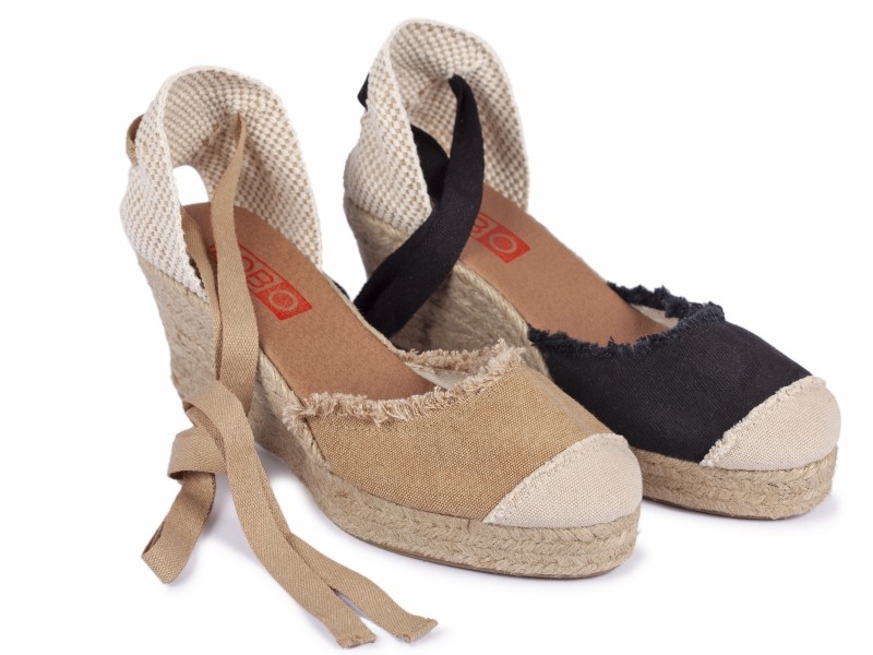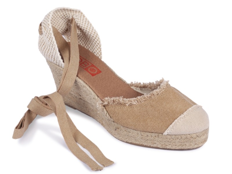 Alpargata de yute de cuña media con cintas, empeine y puntera en lona piqué desflecada y talonera tradicional en natural.