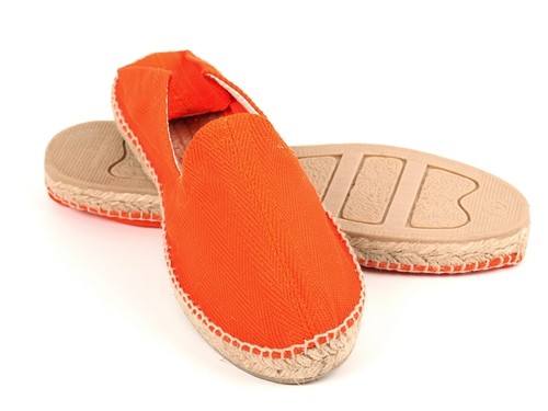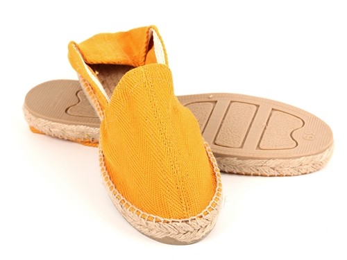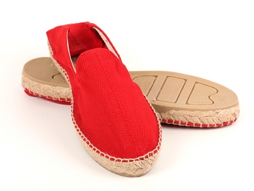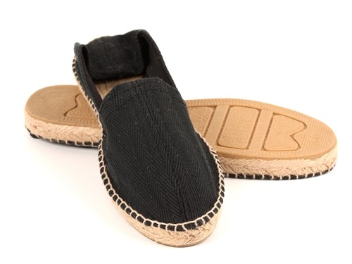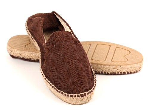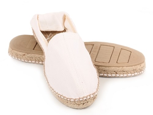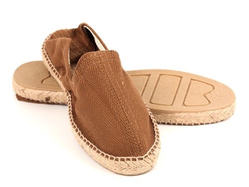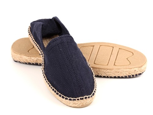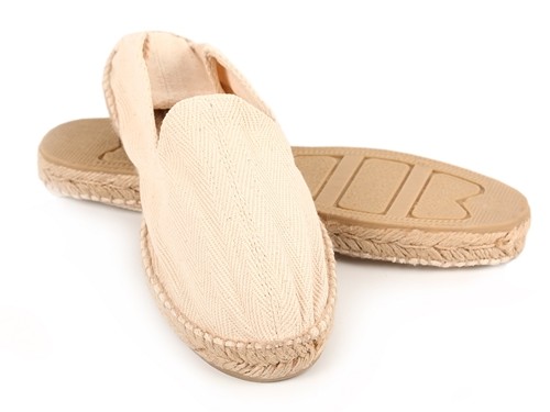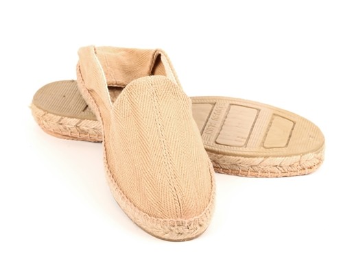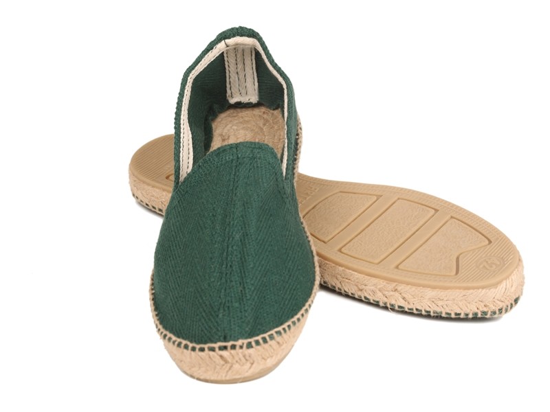Alpargata de yute plana en tela de espiga con lengüeta o copete. Toda la suela está recubierta de una fina capa de caucho para alargar la duración del yute y mejorar la adherencia.