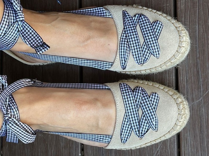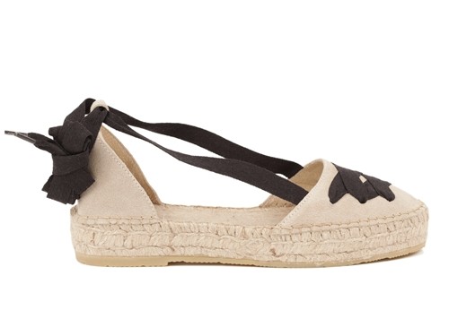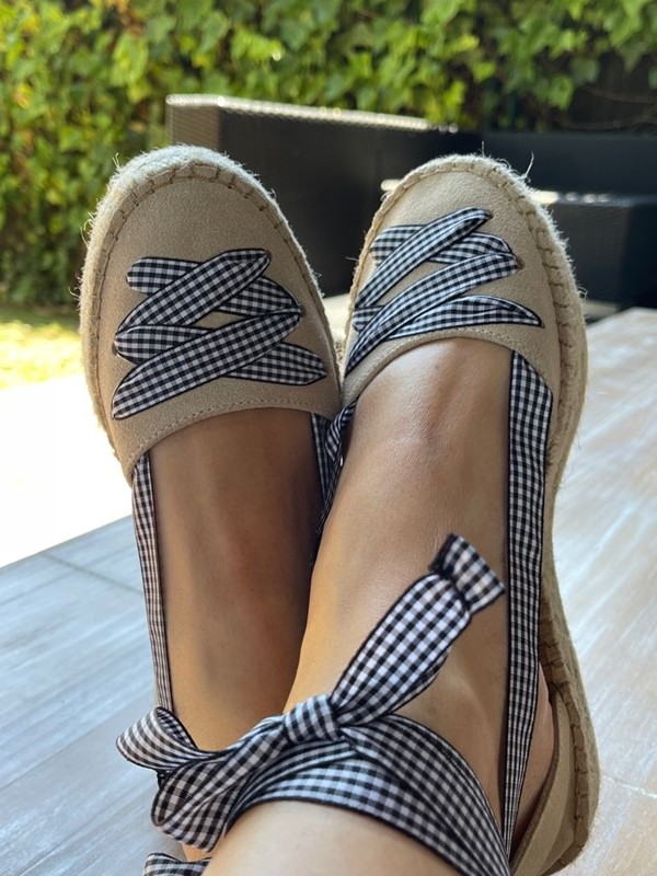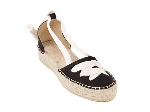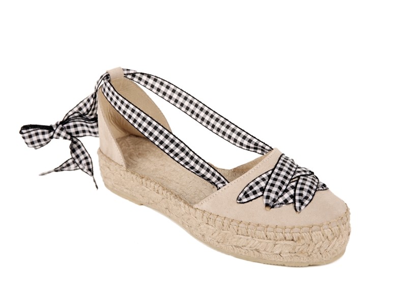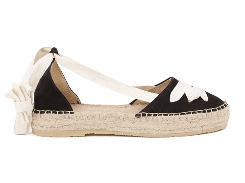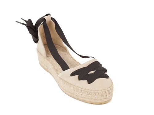 Alpargata de yute plana de doble suela, empeine de serraje en color natural y cintas en negro para atar al tobillo para mujer y niña.