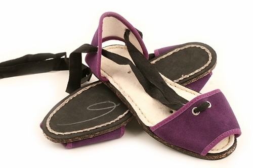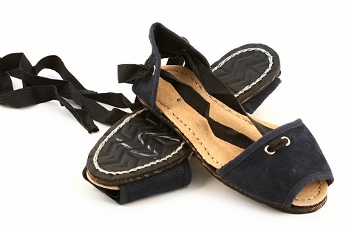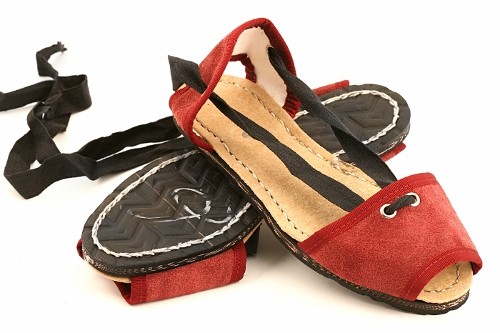 Albarca tradicional levantina con cintas y suela de caucho cosida. Disponible en lona o en serraje dependiendo del color.