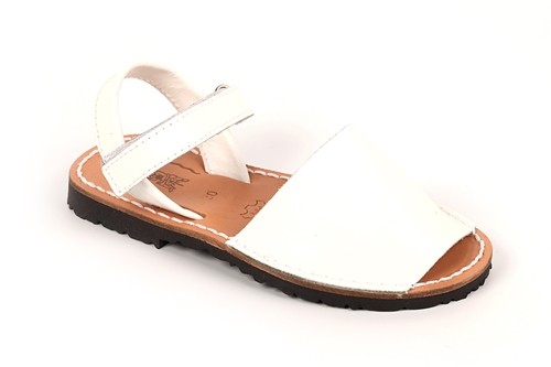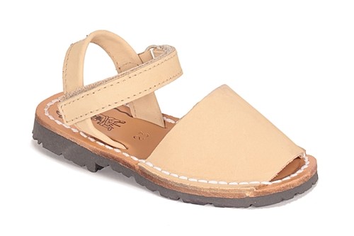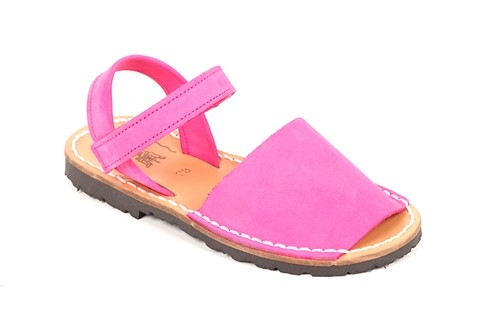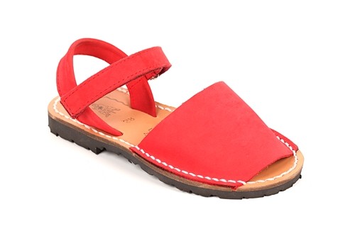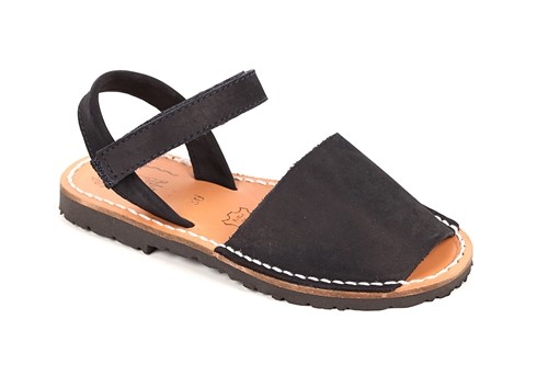 Sandalia ibicenca o menorquina de serraje (nobuck) o piel con velcro. Plantilla de piel cosida y suela de caucho ultra ligera.